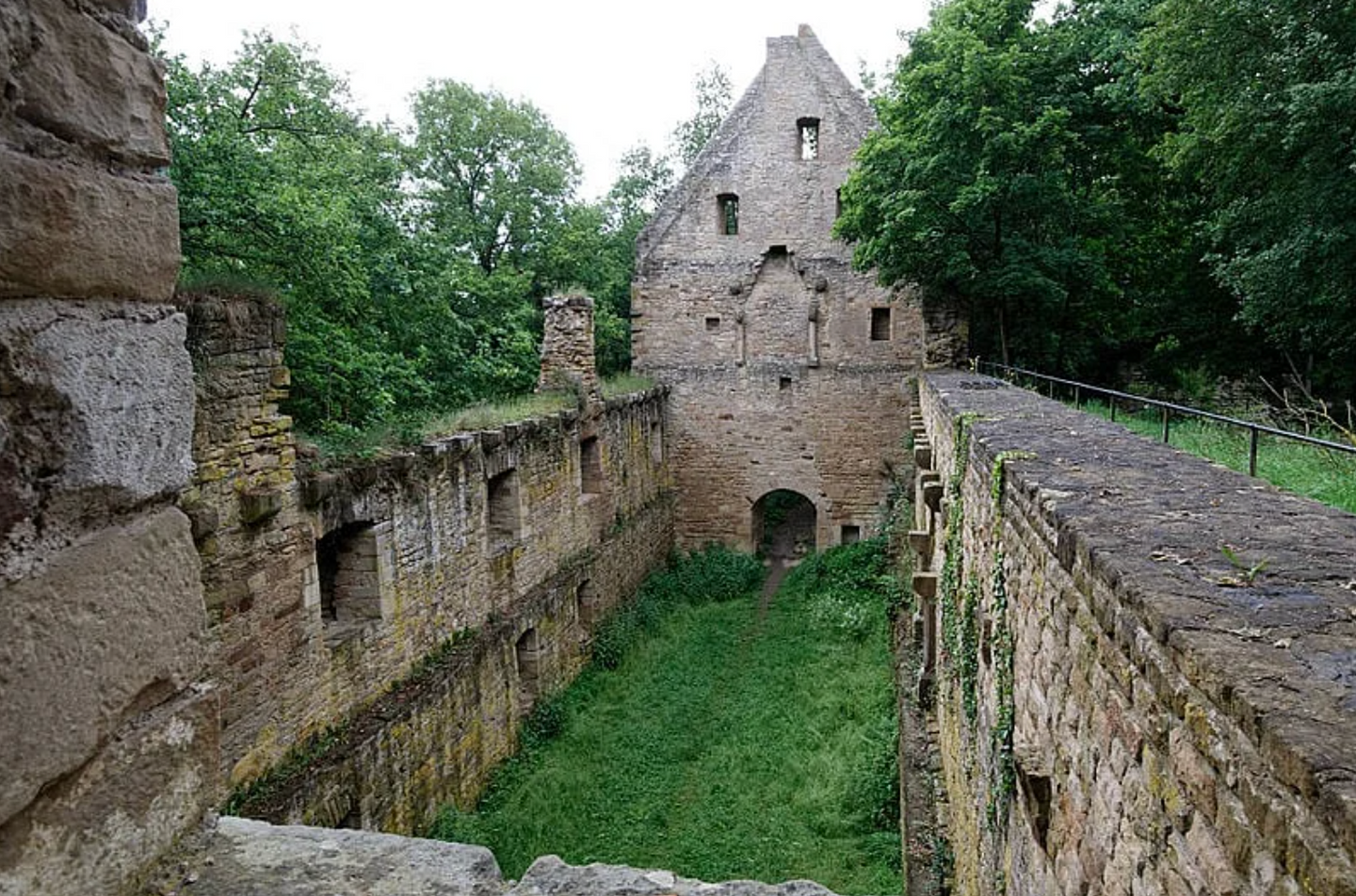 Jutta von Sponheim is said to have been born at Sponheim Castle, the ancestral seat of the Counts of Sponheim. Today's castle ruins are supported by the approximately 130-meter-long tip of a mountain spur, which is surrounded by the Ellerbach on the south and east sides. Hildegard was brought to Jutta when she was eight years old.